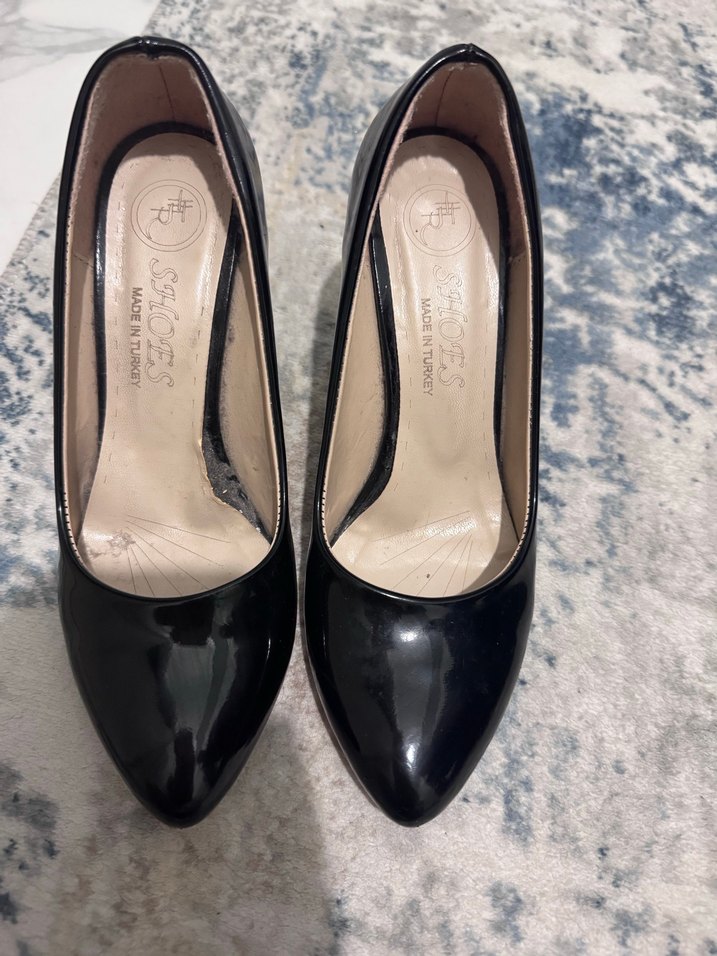 Siyah parlak stiletto topuklu, parlak yılan derisi desenli, kauçuk malzemeden yapılmış klasik şıklıkta kadın ayakkabısı.