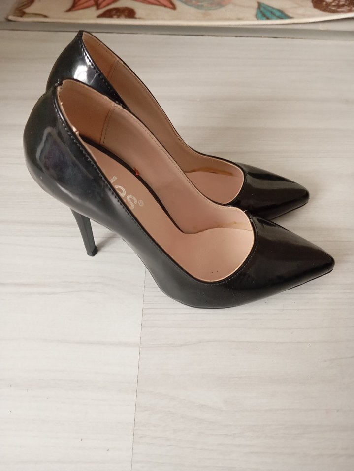 Siyah parlak kadın stiletto ayakkabı modern klasik tarzda