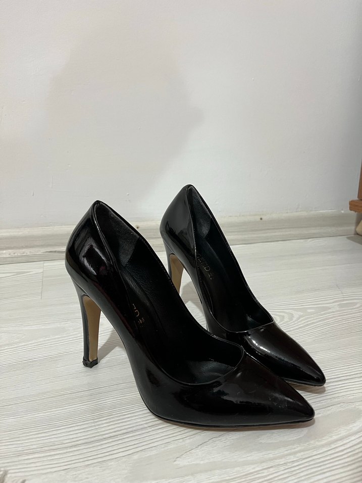 Ofis kullanımı için uygun, parlak siyah stiletto topuklu, sivri burun ve yılan deseni detaylı klasik şıklık ayakkabısı . Sadece 2kere kullandım hiçbir sorunu yok