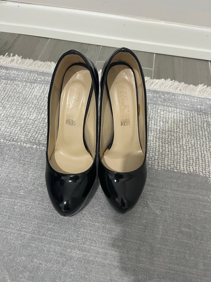 Siyah parlak stiletto topuklu ayakkabılar, modern klasik tasarıma sahip, ofis kullanımı için uygun. Kauçuk malzemeden yapılmış ve desensizdir.