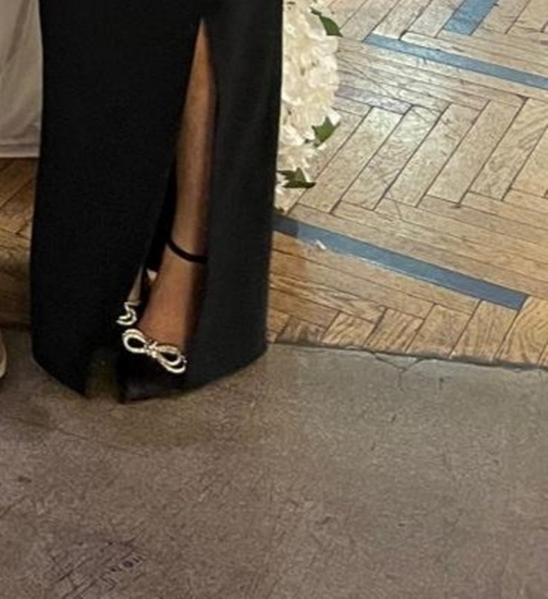 Kadın abiye ayakkabılar, saten dokulu, yırtmaç detaylı, parlak siyah renkte ve stiletto topukludur. Minimalist gotik tarzda, klasik şıklık sunar.