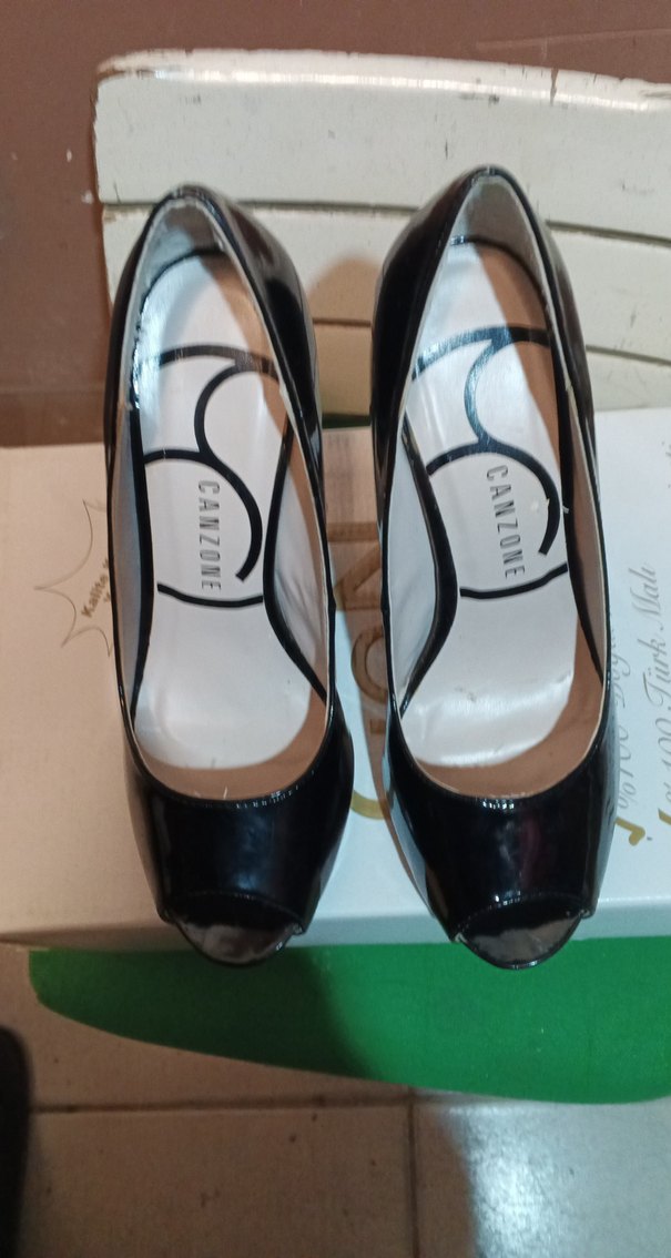 Parlak siyah stiletto topuklu, baskılı kauçuk malzemeden üretilmiş, çağdaş iş tarzına uygun kadın ayakkabı. İç kısmında CANZONE markası bulunur.