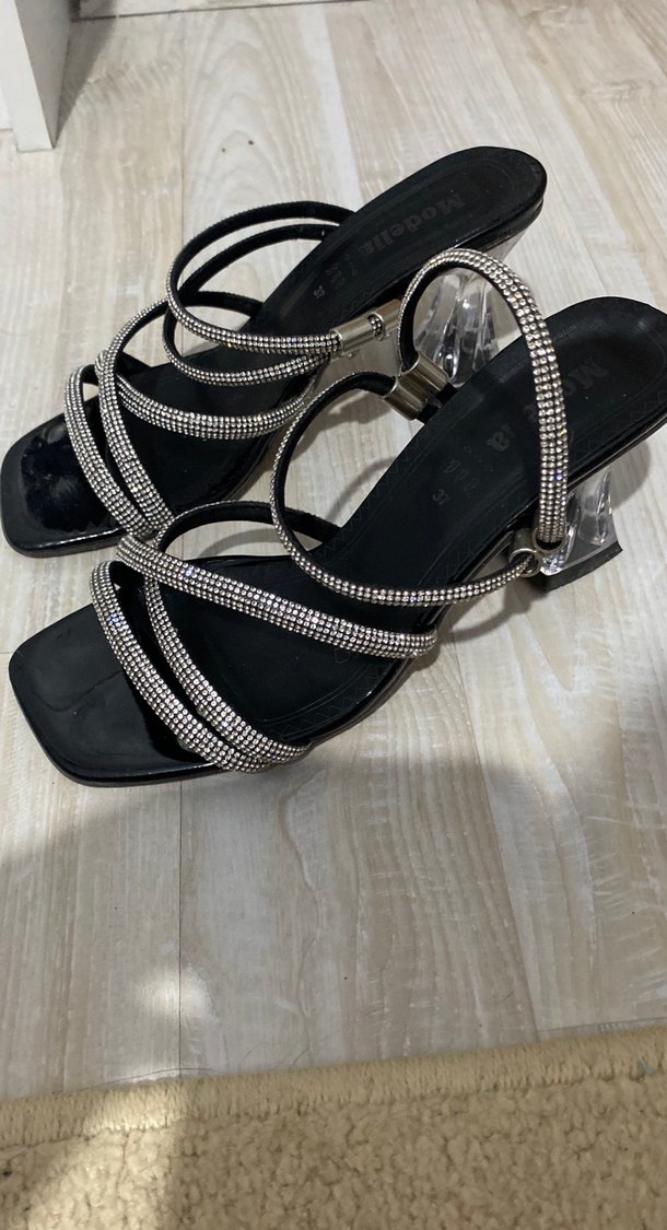 Siyah parlak stiletto topuklu, yılan desenli kayışlı ve tokalı kadın ayakkabı. Şeffaf topuklu, klasik zarafet için uygun.