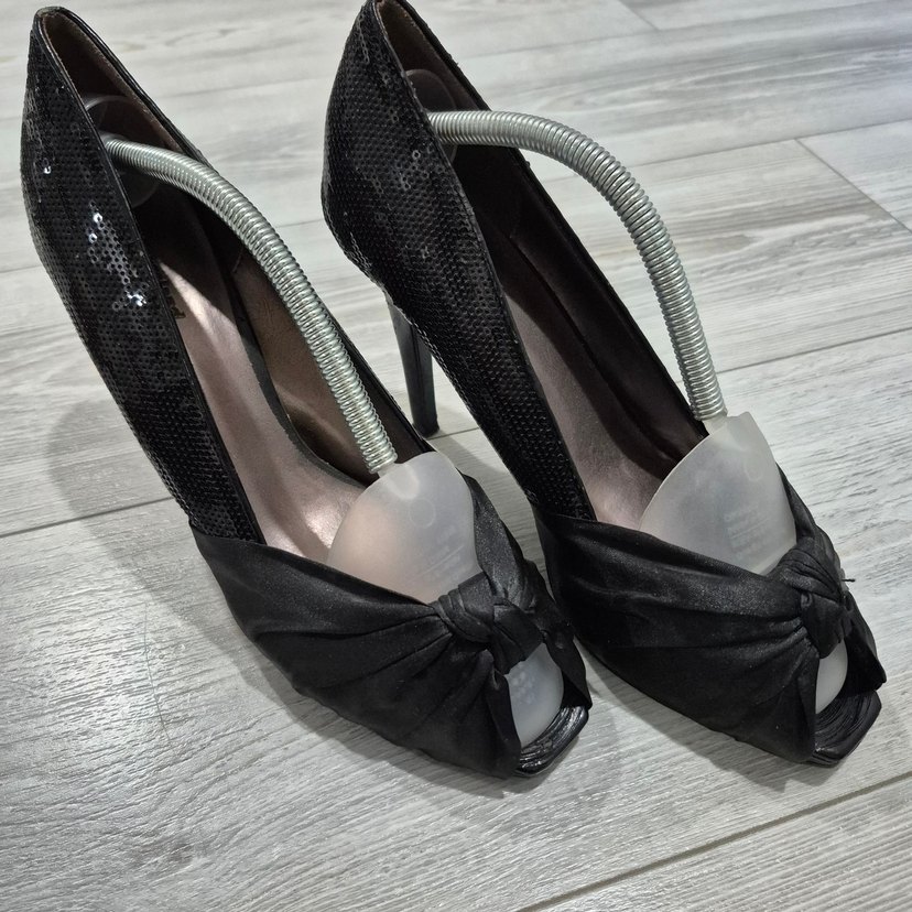 Siyah parlak stiletto topuklu kadın ayakkabı. Yurt disindan alindi 3 sene önce. Topuk kisminda ufak tasa takilma var,cok göze görünmüyor (görselde mevcut). Giyimi rahat ve parmaklar öne kaymiyor. Güncel fiyati 25€ (1250 TL) civari. Ben fiyati düsük tutuyorum topuktaki ufak defodan dolayi. Beden: 41 numara