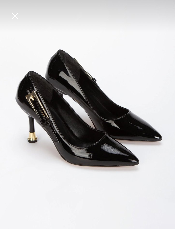 Parlak siyah renkli, stiletto topuklu kadın ayakkabısı. Kemer tokası ve hafif yılan derisi desenli, ofis için uygun.