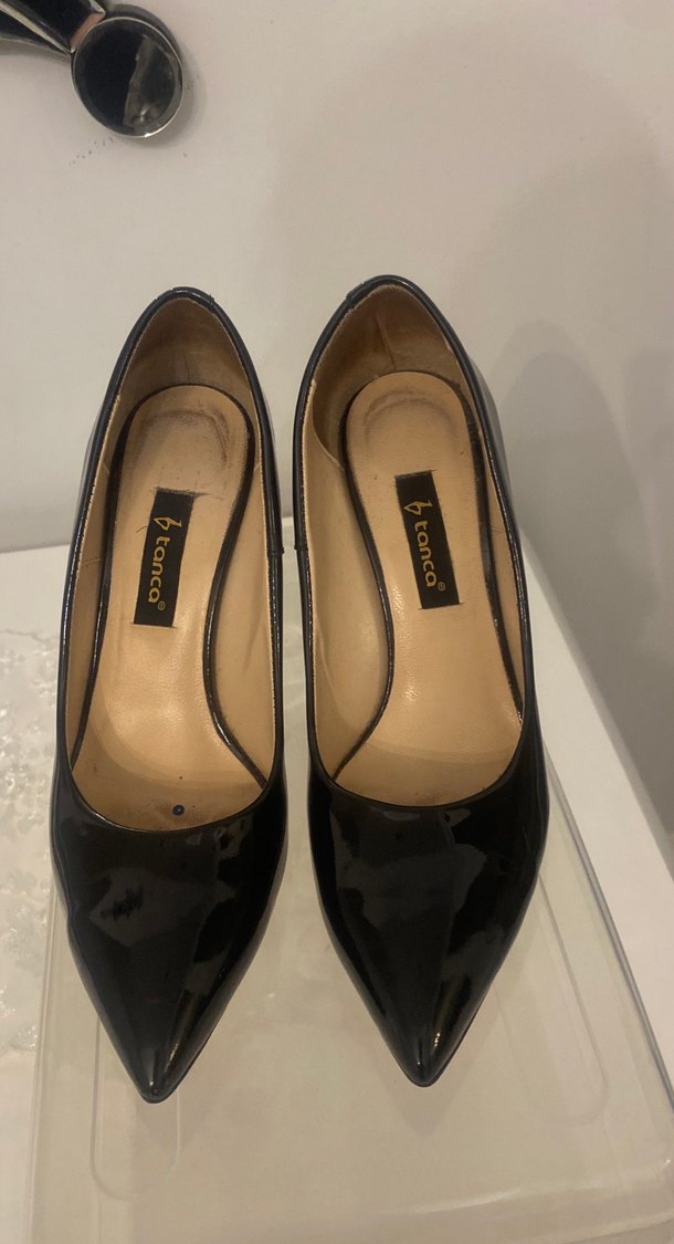 Siyah parlak yılan desenli stiletto topuklu ayakkabılar, kauçuk malzemeden üretilmiştir. Ofis kullanımı için klasik ve gotik tarzda şıklık sunar.