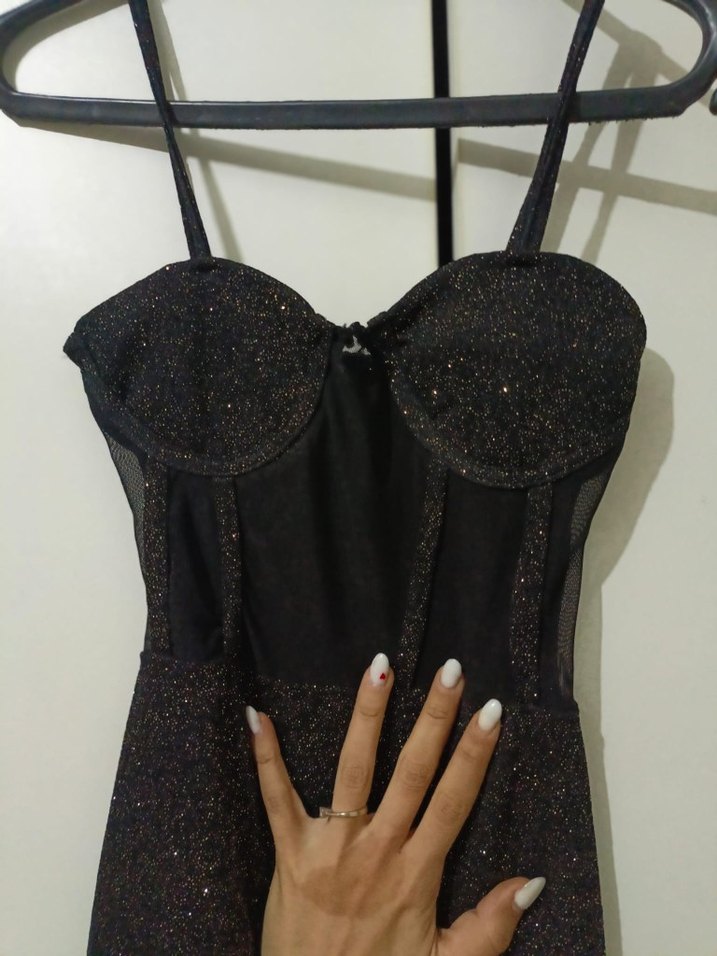 Siyah, parlak detaylara sahip straplez ve ince askılı, vücuda oturan midi elbisedir. Parti için uygundur. ✨