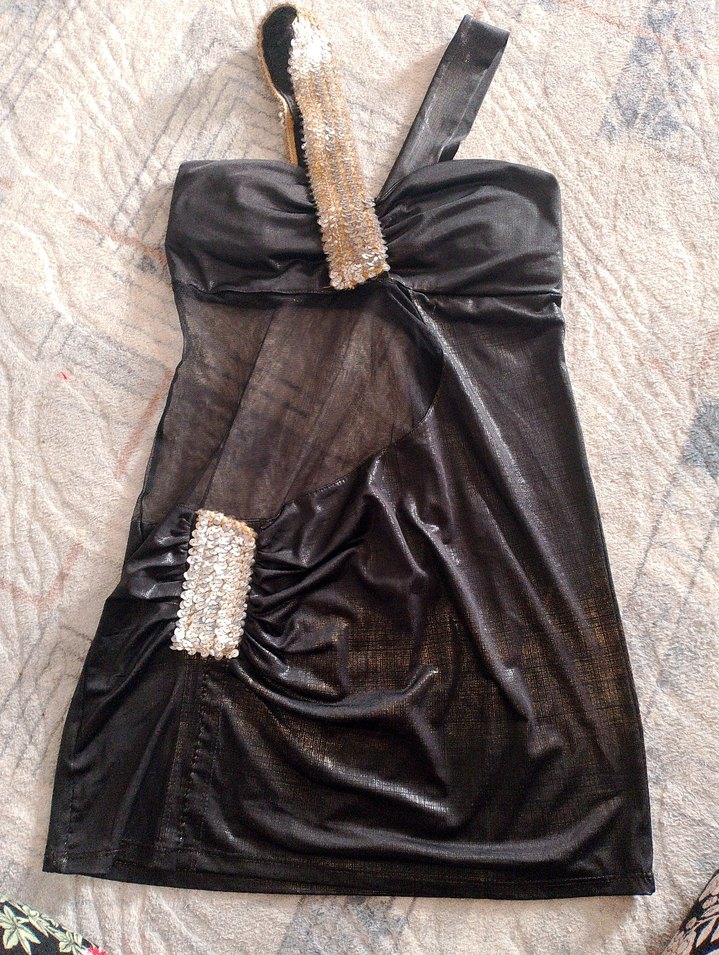 Bu siyah parlak midi elbise, straplez yakaya ve ince askılı kollara sahip, drapeli detaylarla tasarlanmıştır. Avant-garde tarzı ve parlak kumaşıyla parti için uygundur. ✨