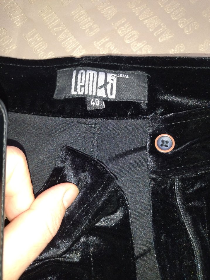 Düğmeli, siyah parlak süet erkek pantolon. Baskılı detaylara sahip, midi boyda ve fitted kesim. Romantik buluşmalar için uygun. 40 beden.kadife.marka temsili