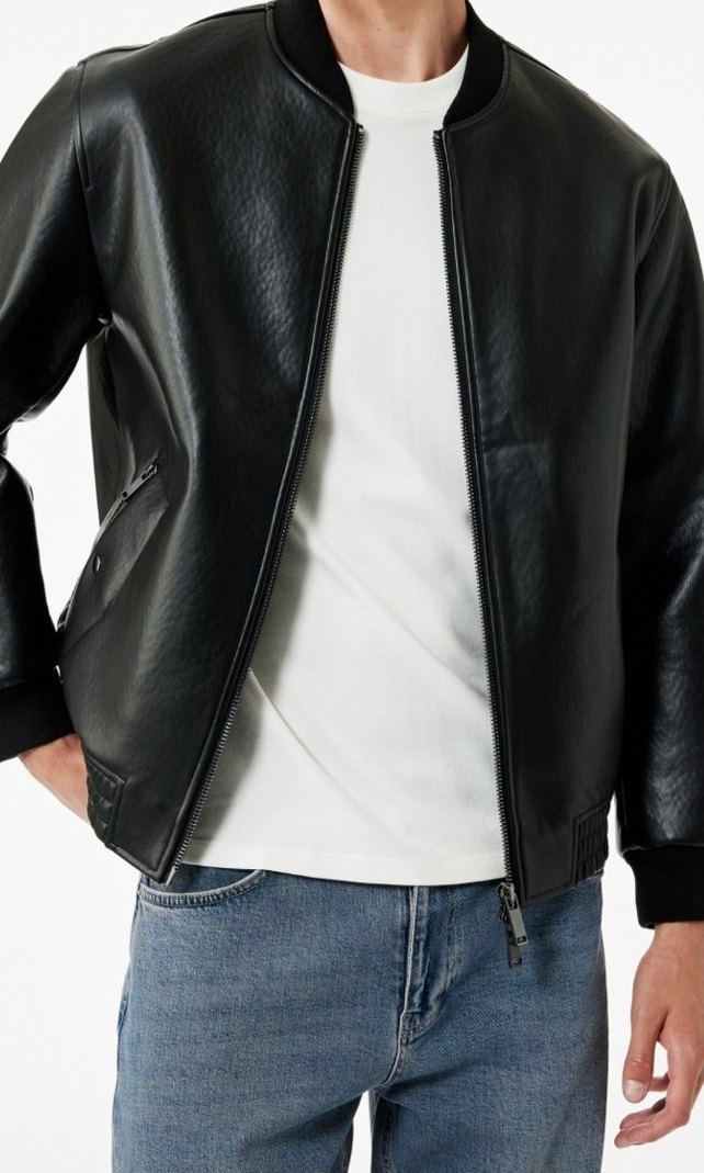 Siyah parlak suni deri , bisiklet yaka ve uzun kollu erkek ceket. Regular fit ve normal boyda, ön fermuarlı ve yan cepler fermuarlı. Günlük kullanıma uygun.
