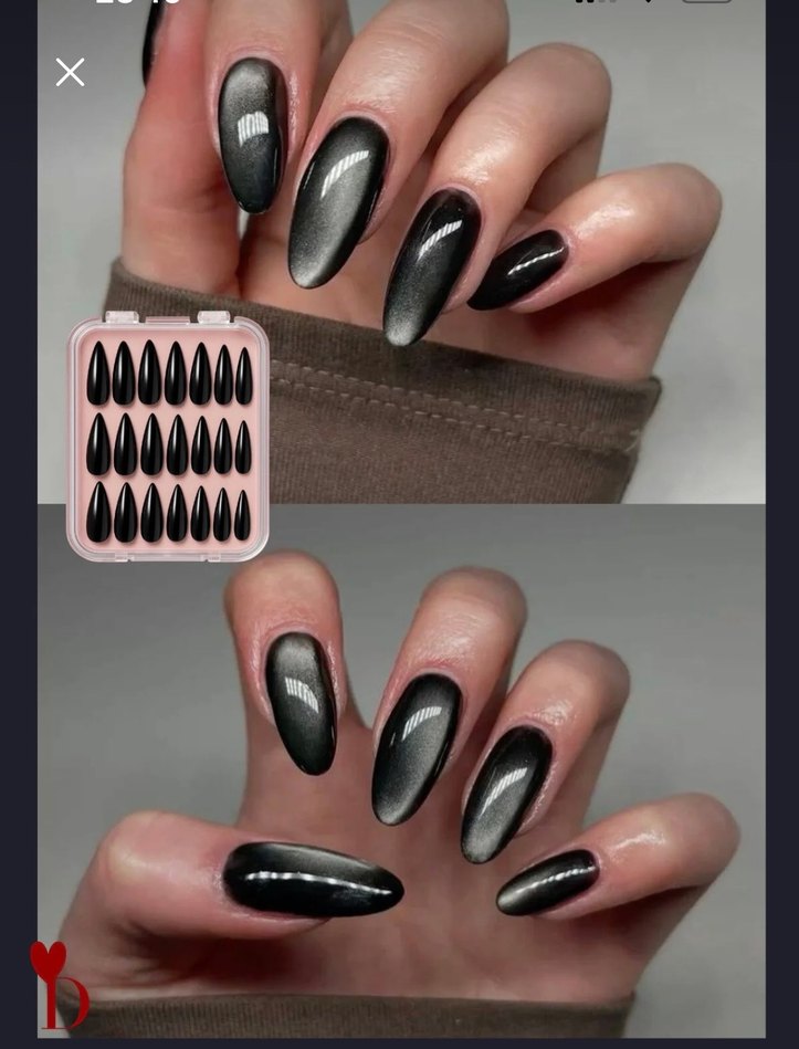 Kompakt kutuda sunulan, sivri badem şekilli siyah parlak takma tırnak seti.