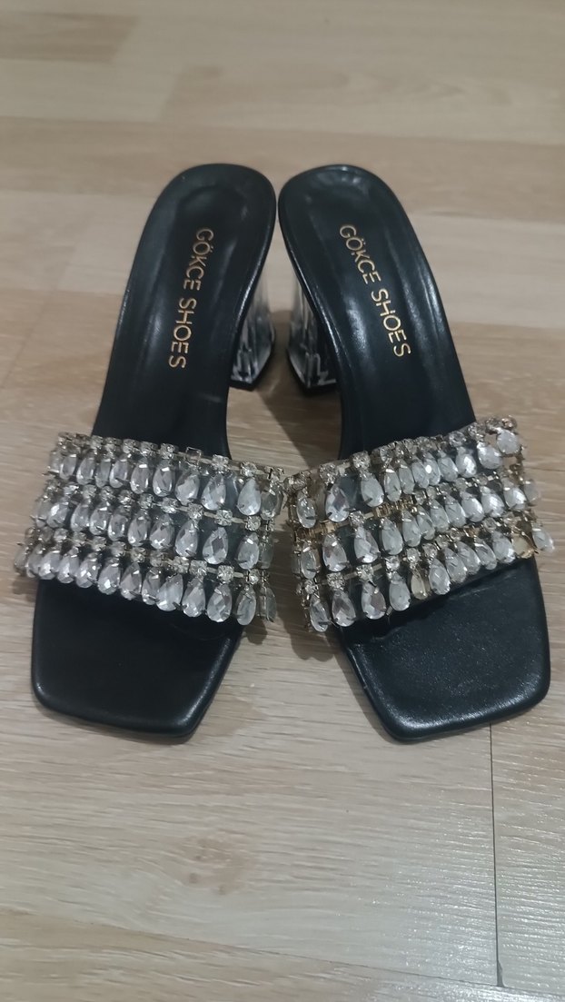 Gokce Shoes markalı, parlak taşlı bantları ve yılan desenli blok topuklu siyah kadın ayakkabısı. Kauçuk malzemeden, düğünler için uygun.