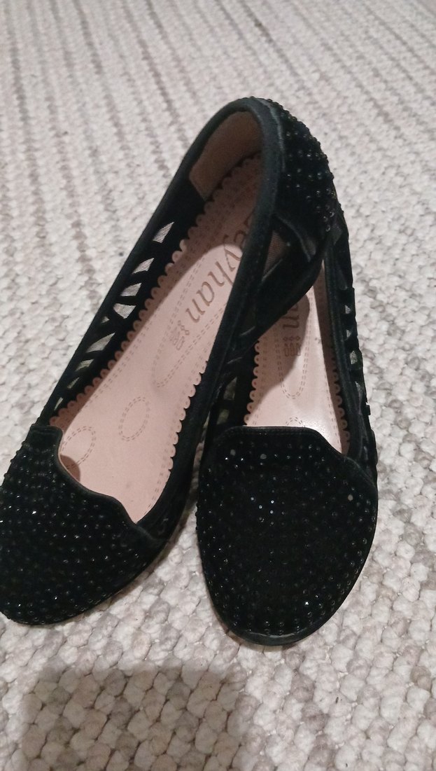 Siyah parlak taşlı dolgu topuklu, nubuk gibi malzemeden yapılmış, gotik tarzda ve klasik şıklıkta kadın babetler. Düğünler için de uygun, şık bir ev ayakkabısı✨( üzerinde hafif soyulma, düşen ama hiç belli olmayan minik taşları vardır.)