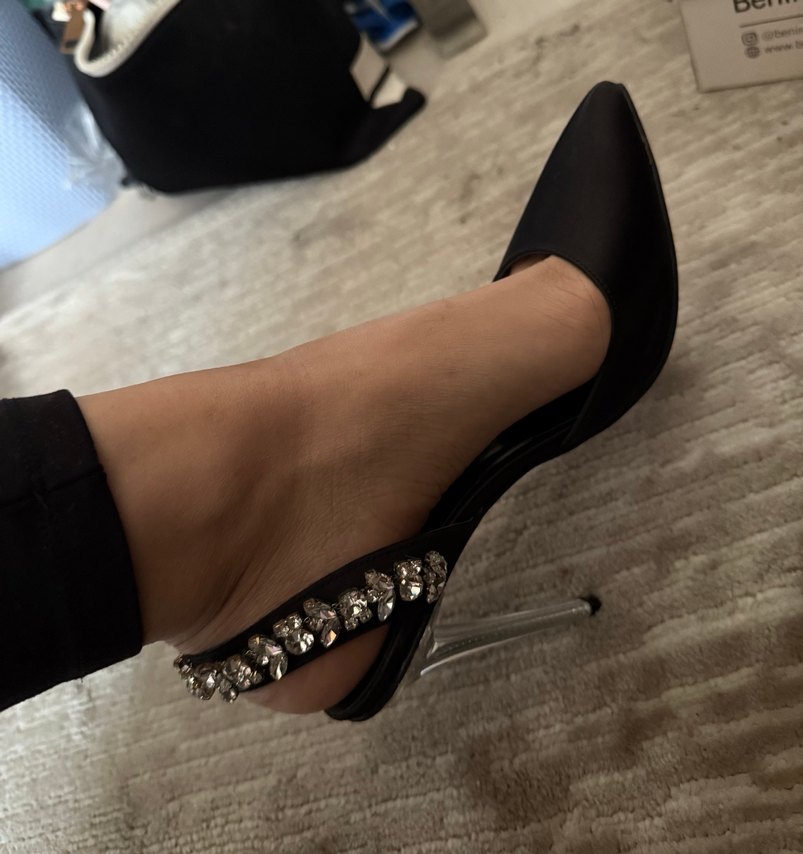 Siyah parlak taşlı detaylara sahip, yılan desenli ince topuklu kadın ayakkabısı. Romantik gece için uygun, gotik tarzda şık bir model.