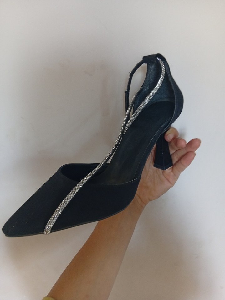 Siyah kadın topuklu ayakkabı, ince topuklu ve parlak taş detaylı, yılan derisi desenli, klasik ve gotik tarzda şık bir görünüm sunar.