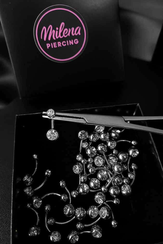 Milena markalı, siyah ve parlak taş detaylı kadın göbek piercing. Gösterişli gotik stile uygun, trend belirleyiciler için avant-garde tasarım. ✨