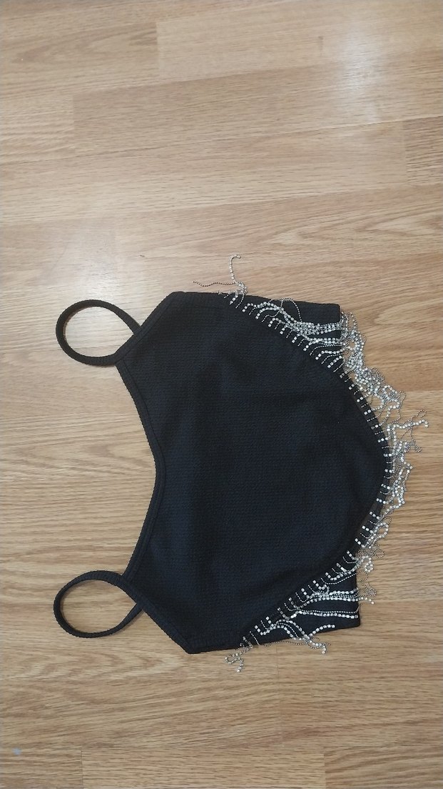 Siyah, parlak taşlı askılı, kısa kesim ve vücuda oturan bu büstiyer, avant-garde tarzıyla partiler için uygundur. ✨tertemiz.