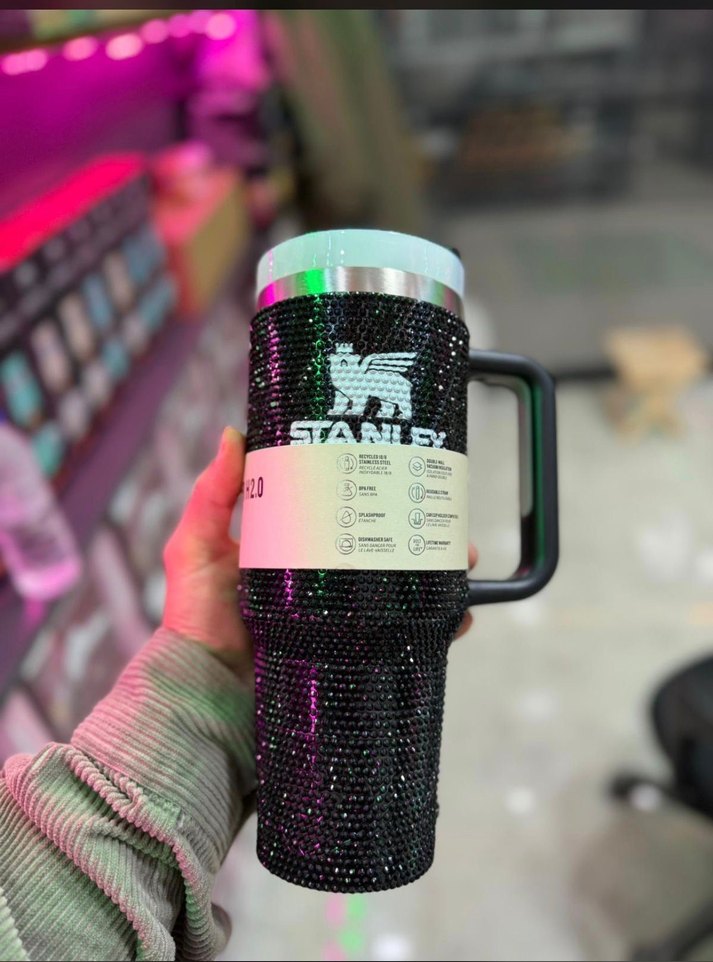 Siyah parlak taşlarla kaplı Stanley termos bardak, yalıtımlı yapısı ve sağlam kulp ile kolay taşınır.