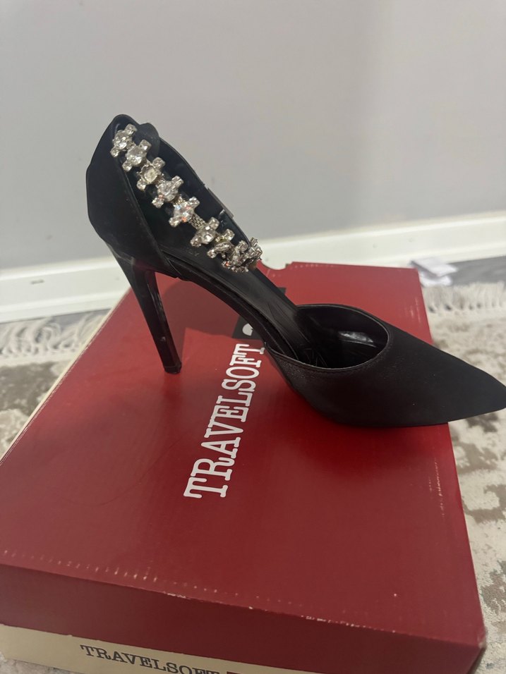 Siyah, parlak taş detaylı ve yılan derisi desenli, kauçuk malzemeden yapılmış stiletto topuklu ayakkabı. Cesur ve gösterişli görünüm için uygundur.