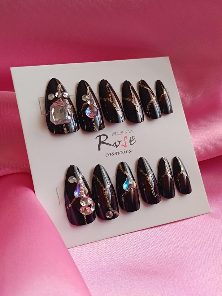 Siyah tırnak süslemeleri, parlak taşlar ve ince altın çizgilerle şık bir görünüm sağlar. Rose Cosmetics ürünüdür.
