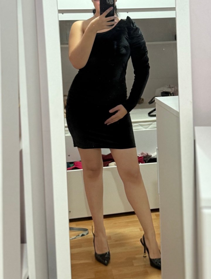 Parlak siyah süet kumaştan, tek omuz ve askılı kol detaylı, vücuda oturan mini elbise. Romantik geceler için ideal.
