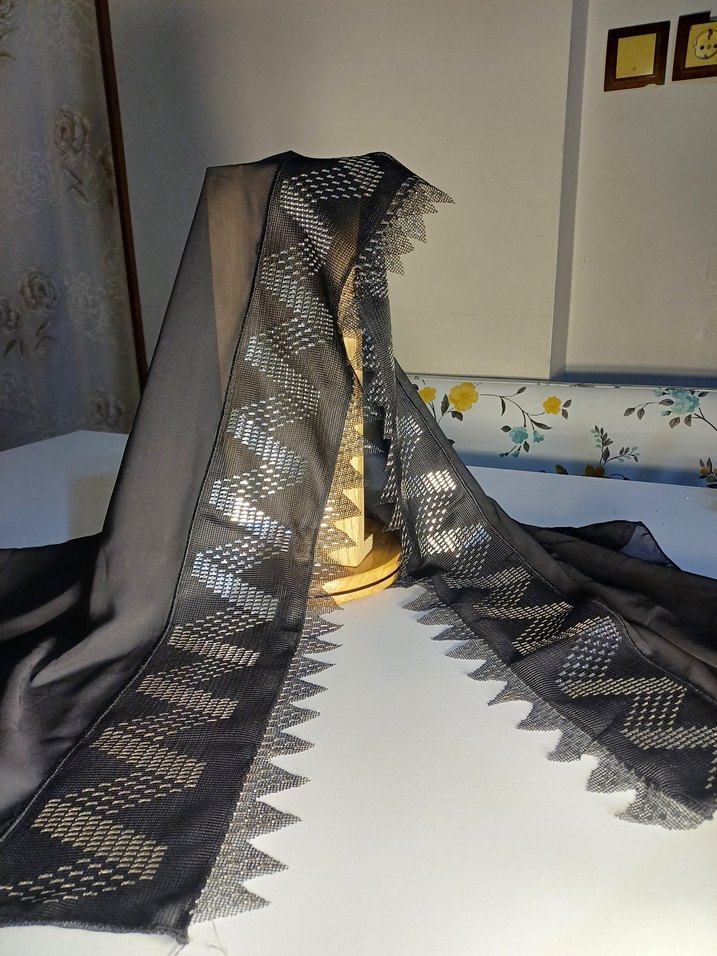 Sentetik kumaştan, parlak ve geometrik desenli kenarları olan, drapeli siyah şal. Geleneksel tel kirma mevlütlük Her ürün farklı.fiyattir urun fiyati 2500