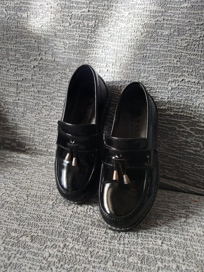 Siyah parlak ve tokalı, kauçuk malzemeden yapılmış erkek çocuk loafer ayakkabı. Desensiz ve klasik şıklık sunar.