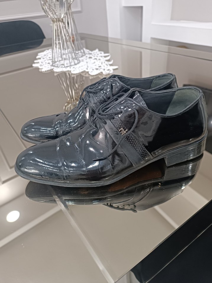 Siyah parlak yüzeyli, yılan derisi desenli ve tokalı erkek klasik ayakkabılar. Ofis kullanımı için uygun, dayanıklı kauçuk malzemeden yapılmıştır.