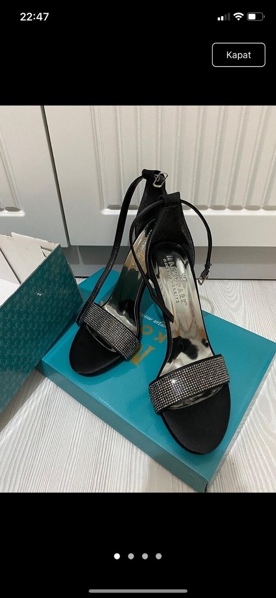 Parlak siyah, tokalı ve ince topuklu kadın ayakkabısı. Romantik akşamlar için çağdaş ve klasik şıklık sunar.
