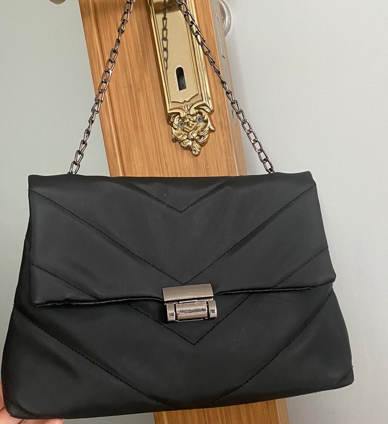 Siyah parlak yüzeyli, tokalı kapamalı ve zincir askılı kadın çantası. Modern klasik tarzda, sentetik kumaştan üretilmiştir.