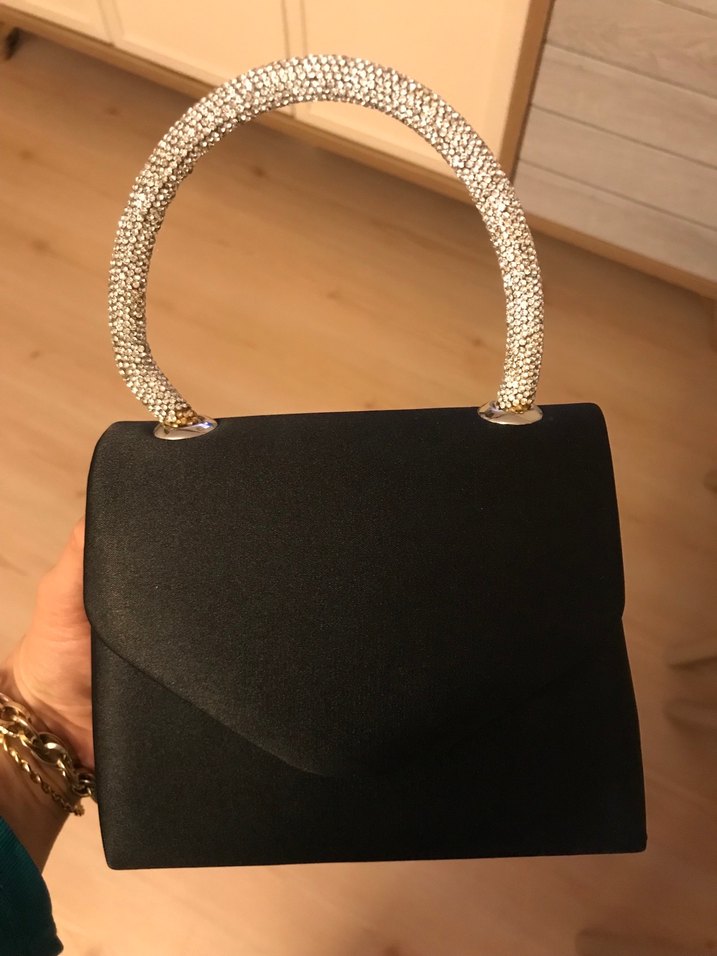 Parlak siyah sentetik kumaştan yapılmış, tokalı detaylı ve ışıltılı saplı clutch çanta, romantik akşamlar için uygun. ✨