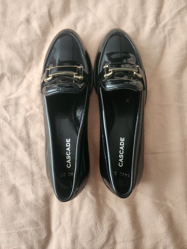 Siyah parlak tokalı kadın klasik ayakkabılar, ofis için uygun blok topuk ve baskılı desene sahip. Dayanıklı kauçuk malzemeden üretilmiştir.