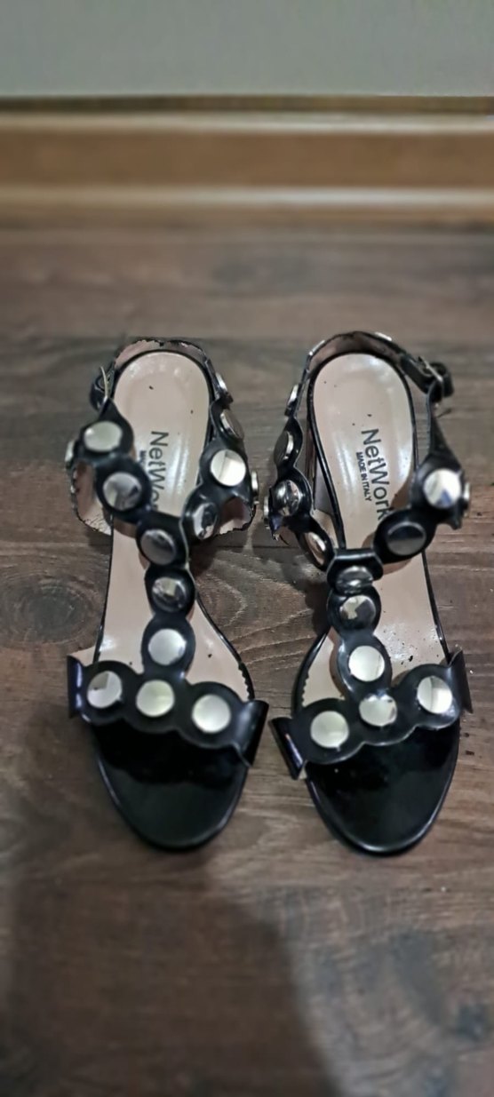 NetWor markalı, tokalı, desenli, siyah parlak kadın topuklu ayakkabılar, romantik gece için uygun.
