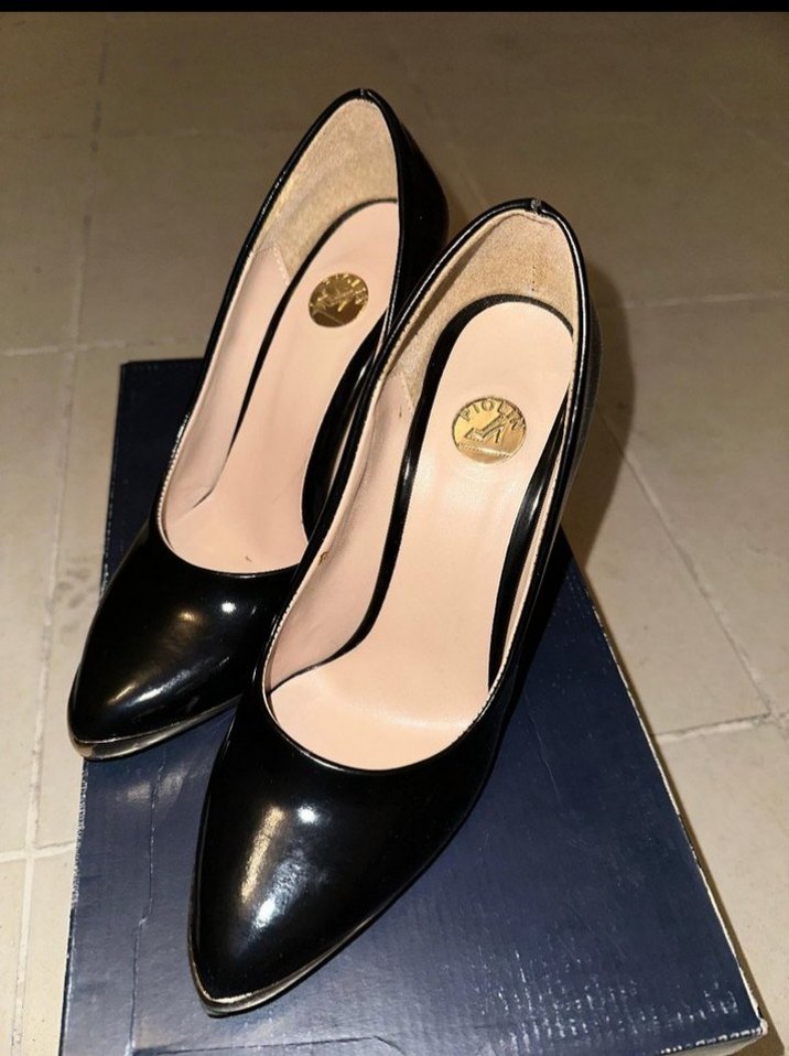 Siyah parlak stiletto topuklu kadın ayakkabılar, tokalı detaylı modern klasik tasarıma sahiptir ve ofis kullanımı için uygundur. Rahatlık için kauçuk malzemeden üretilmiştir.