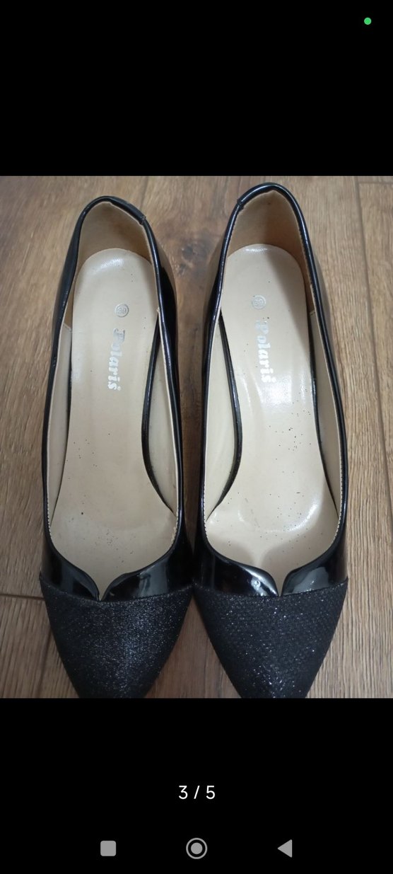 Siyah parlak ve tokalı lastik malzemeden yapılmış kadın stiletto topuklu ayakkabılar, klasik şıklık ve ofis kullanımı için uygun. ( kere kullanılmıştır temiz ürün )