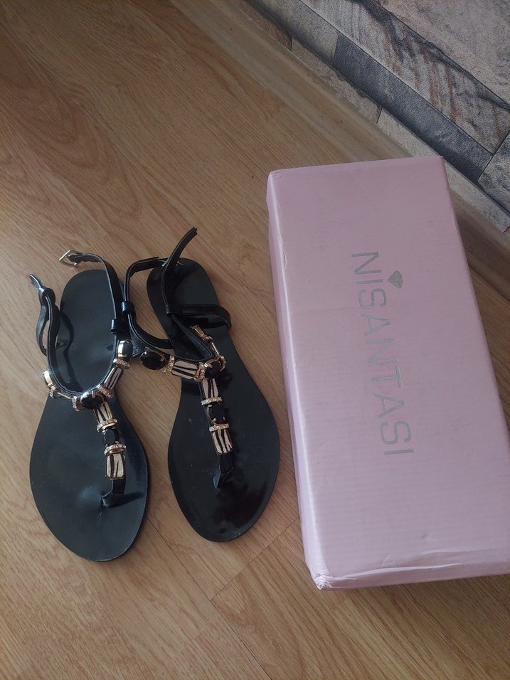 Parlak siyah renkte, tokalı kayışlara sahip stiletto topuklu kauçuk kadın sandalet. Paris esintili bohem tarzıyla romantik akşamlar için uygun. Kutuda "NISANTASI" yazısı var.