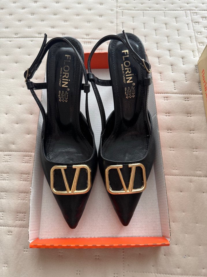 Siyah parlak ve tokalı kayışlı stiletto topuklu ayakkabılar, dayanıklı kauçuk malzemeden, romantik akşamlar için ideal. FLORIN marka.