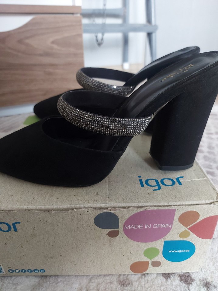 Siyah parlak, tokalı bantlı blok topuklu kadın ayakkabısı, üzerine baskılı detaylı. İspanya üretimi, Igor markası.