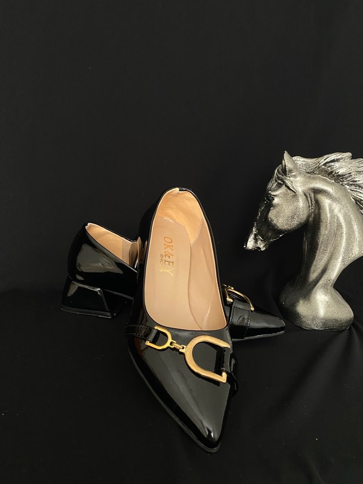 Siyah Parlak Tokalı Yılan Desenli Topuklu Kadın Ayakkabı