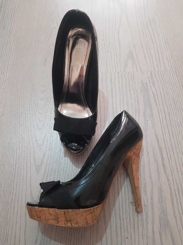 Siyah parlak stiletto, yüksek topuklu ve tokalı detaylı, mantar dokulu platformlu. Romantik gece için gotik tarzda uygun.