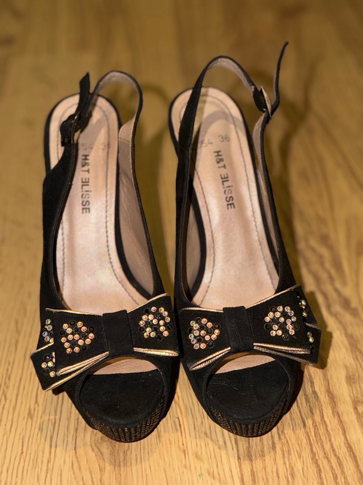Siyah parlak topuklu kadın ayakkabısı, nakışlı fiyonk detayı ve tokalı kayışa sahip, romantik akşamlar için uygun. Marka: H&TELISSE.