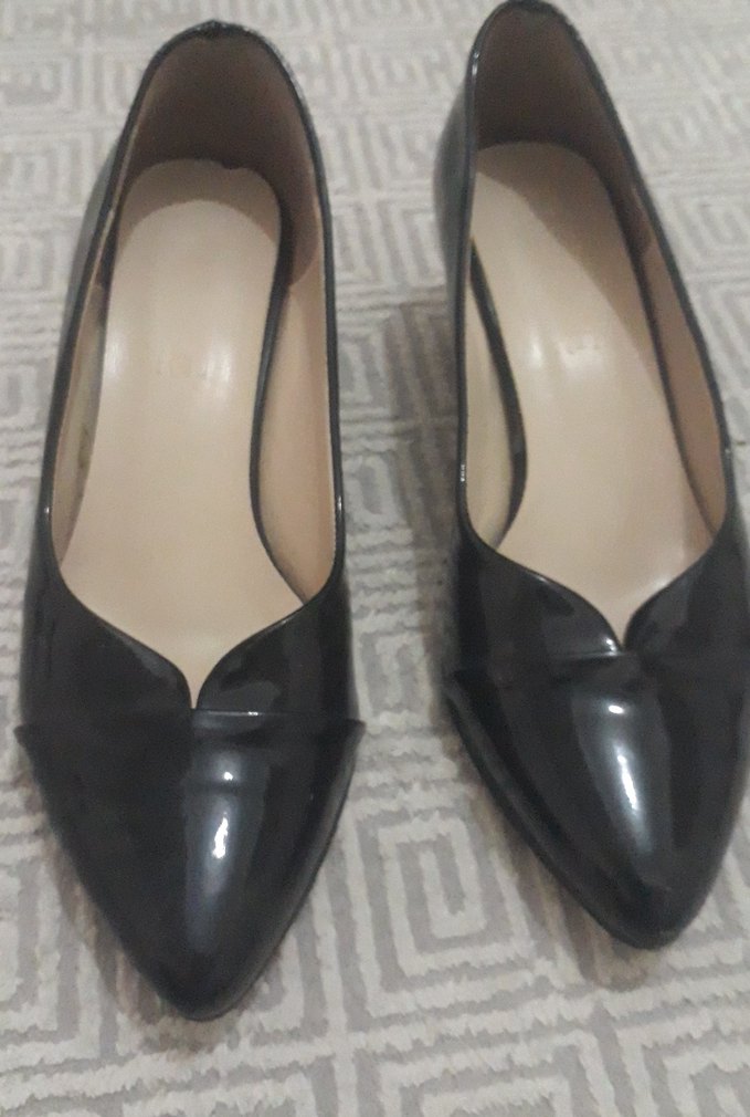 Ofis için uygun, klasik tasarımlı siyah parlak kadın stiletto. Kauçuk malzemeden ve konvansiyonel stile sahip.