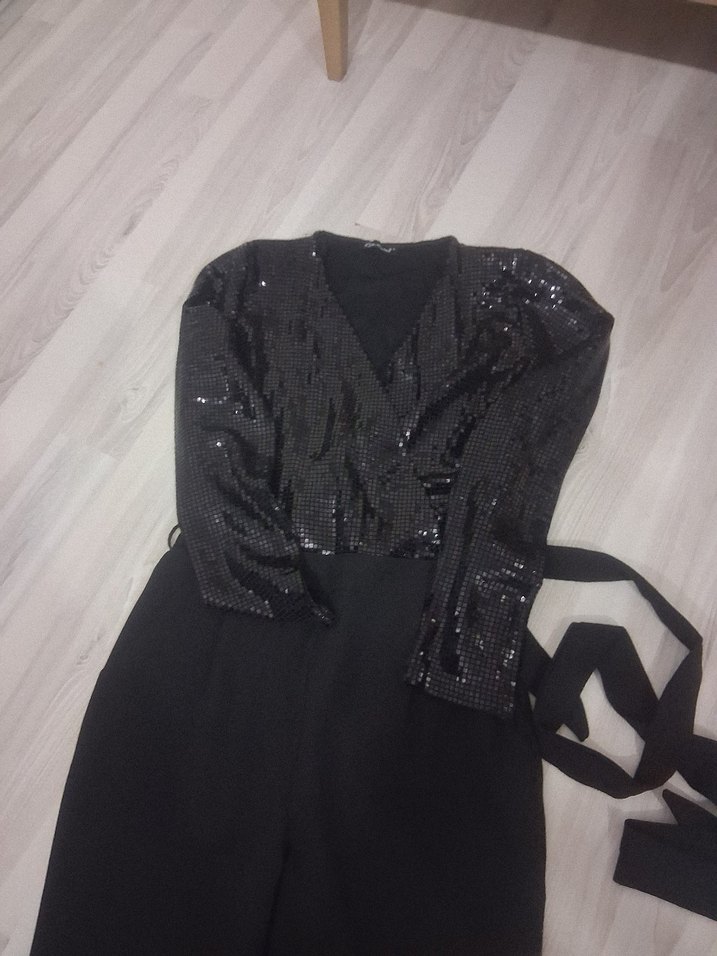 Uzun siya tulumlbise, v yaka ve kemerli, üst kısmı parlak 2 KOL ARASI 46 CM UZUNLUK 140 CM