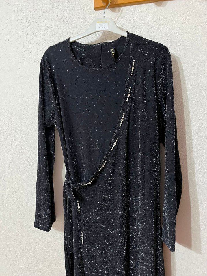 Parlak siyah sentetik kumaştan, uzun kollu, bisiklet yaka ve fermuarlı sırt detaylı, nakış işlemeli, dar kesim kadın triko elbise. Günlük kullanım için uygundur. Hiç giyilmedi. Dar geldiği için kullanamadım. Ama kumaşı modeli harika.