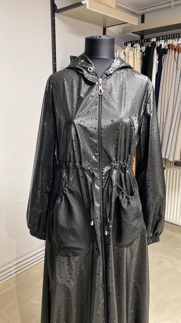 Parlak siyah renkte, uzun kesim, bol ve kemerli kadın yağmurluğu. Notlu yakalı, uzun kollu ve büyük ön ceplidir. Sokak stiline uygun. ️