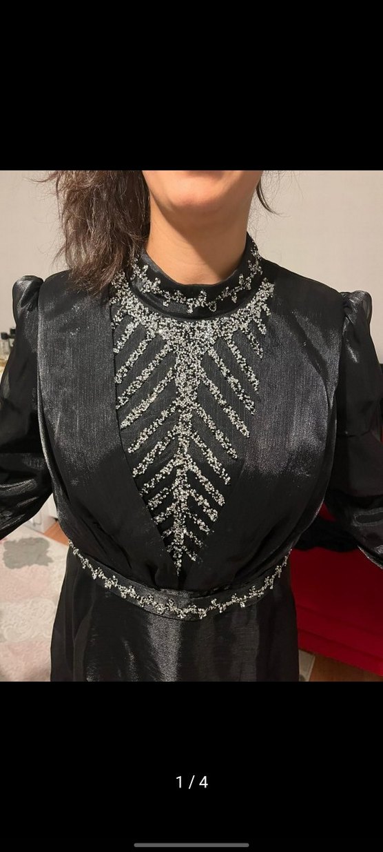 Siyah, parlak, uzun kollu, yüksek yakalı ve nakışlı payet detaylı klasik goth tarzında abiye elbisedir. ✨ 50 beden 1 kez kullanildi