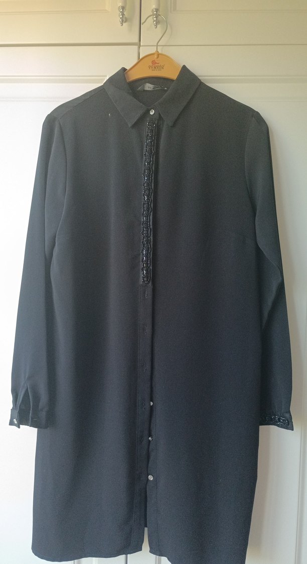 Siyah, parlak ve ipeksi kumaştan uzun kollu, düğmeli ve notalı yaka detaylı, bol kesim kadın tunik. Ofis için uygun goth tarzı. uzunluk 86 cm