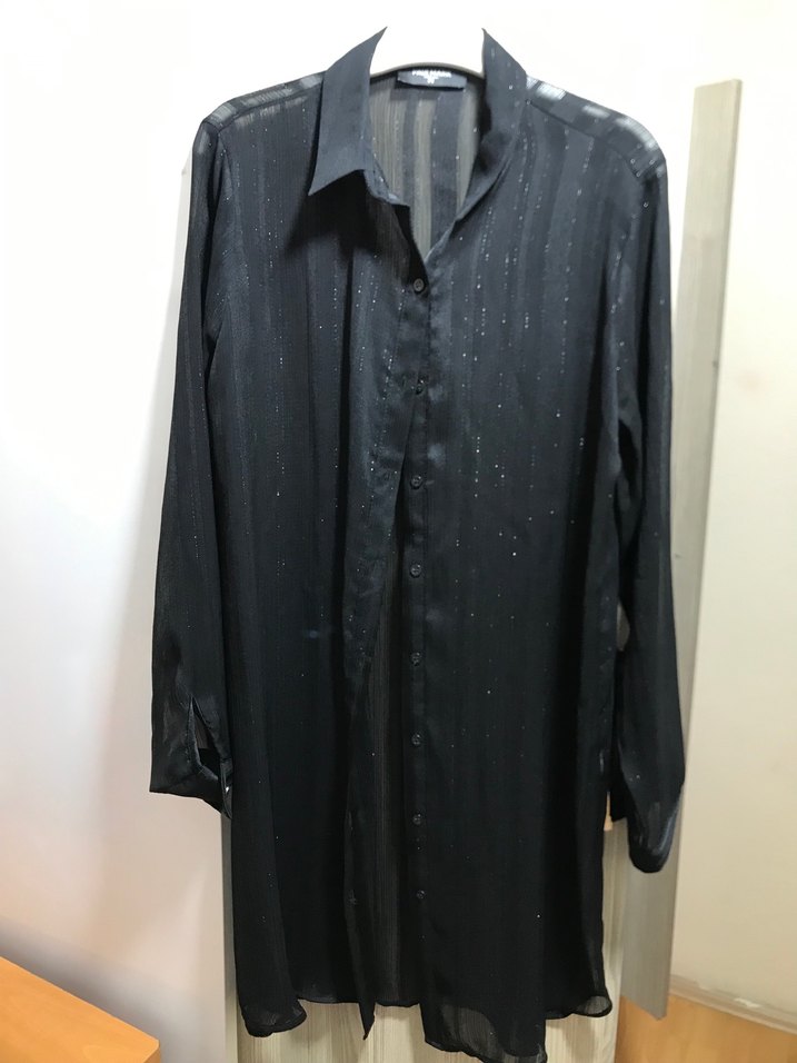Siyah parlak ve ipeksi kumaştan uzun kollu, düğmeli ve yakalı tunik sadece iki kez giyildi