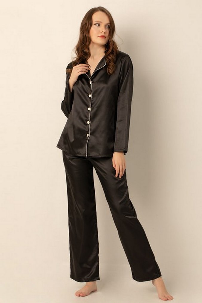 Kadınlar için parlak siyah kumaştan saten pijama takımı doremi