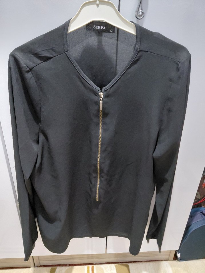 Fermuarlı, uzun kollu, V yaka, parlak siyah saten görünümlü, normal boy midi uzunluğunda, iş ortamına uygun kadın bluz.